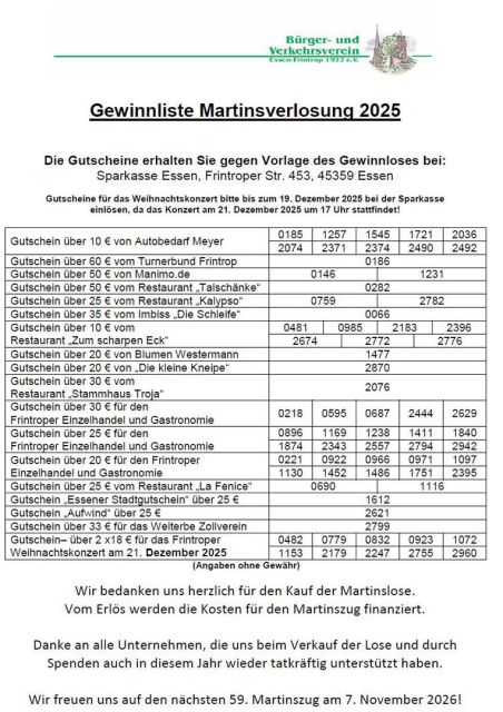 Nach dem Umzug hatte man noch Gelegenheit, am Feuer zu verweilen oder einen der Stände des BVV, der Ehrengarde oder der Fidelen Frintroper zu besuchen. Am darauffoldenden Sonntag trafen sich dann auch traditionell der BVV-Vorstand und einige Frintroper Honoratioren zur Martinsverlosung. Nachfolgende Losnummern haben dabei gewonnen. Der Dank des BVV geht auch an die vielen Unternehmen aus Einzelhandel und Gastronomie, aber auch Vereinen wie der Turnerbund Frintrop, die Gutscheine für diese Verlosung zur Verfügung gestellt hatten.