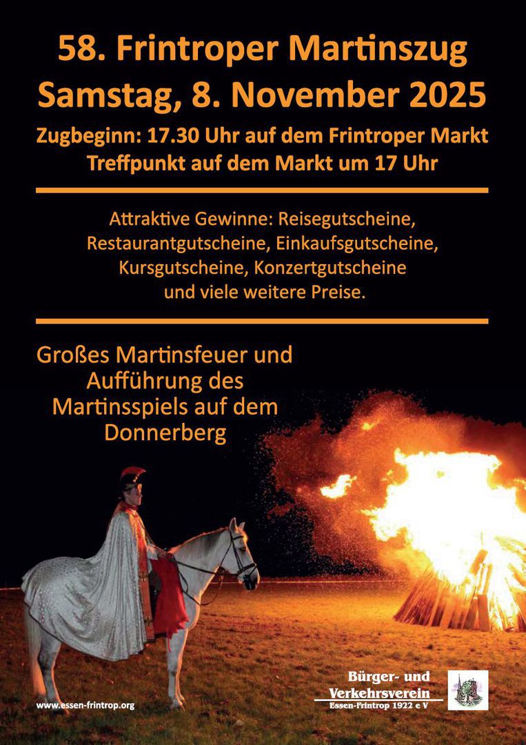 Freuen Sie sich auf den 58. Frintroper Martinszug. Ein Zug, der Menschen aller Altersschichten seit Jahrzehnten fasziniert und zu den allergrößten Zügen in Deutschland gehört.
